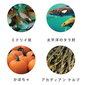 バー、タウリン、塩化コリン、塩化カリウム、イヌリン、メチオニン、フリーズドライさつまいも、フリーズドライかぼちゃ、フリーズドライミドリイガイ、フリーズドライ鱈レバー、フリーズドライ昆布、亜鉛たんぱく質化合物、りんご、ブルーベリー、にんじん、クランベリー、生姜、かぼちゃ、グルコサミン、コンドロイチン、ビタミン E、鉄たんぱく質化合物、アスコルビン酸、ナイアシン、L.アシドフィルス菌発酵物、乾燥 L.カゼイ菌発酵物、乾燥 E.フェシウム菌発酵物、乾燥 B.ビフィズス菌発酵物、ユッカ・シジゲラ抽出物、パントテン酸カルシウム、マンガンたんぱく質化合物、ひまわり油、銅たんぱく質化合物、ビタミン B2、ビタミン A、ビタミン B12、ビタミン K、ビタミン B6、ビタミン B1、ビオチン、亜セレン酸ナトリウム、D3、ヨウ素酸カルシウム、葉酸、ローズマリー抽出物